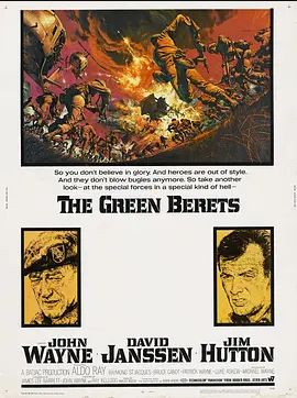 这部片子由约翰韦恩导演,约翰韦恩、大卫强森主演,是过去三十年来所有越战电影中,主战鹰派的扛鼎代表作。约翰韦恩根本就是好莱坞大美国沙文主义的典范,他在西部片里杀印
